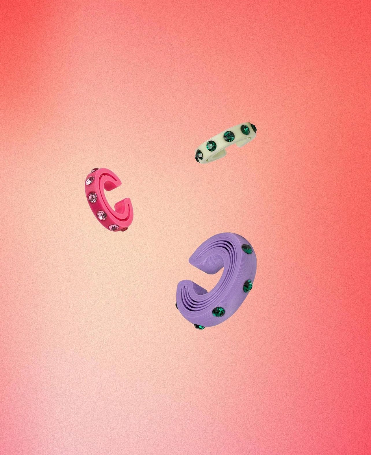 Earcuffs designed exclusively for manufacturing in 3D printers. Made of polylactic acid, a bioplastic that is 100% recyclable and degradable under special conditions in large-scale composting plants, combined with colors crystals.
