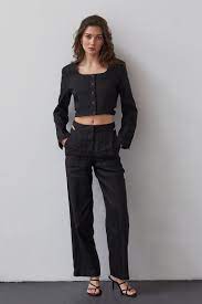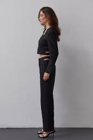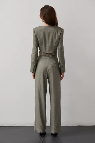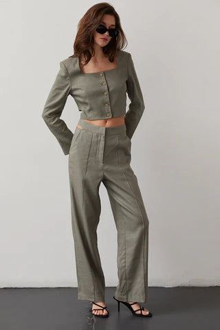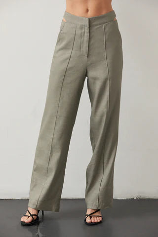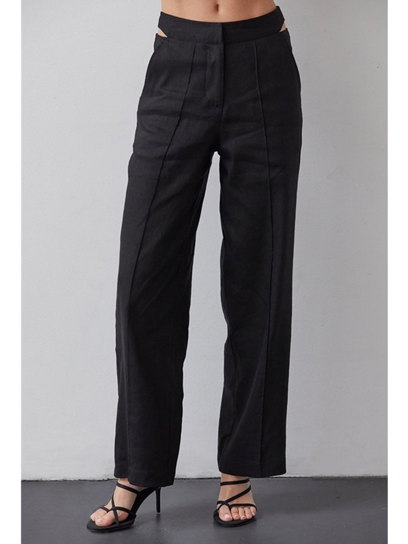 Janey Cut Out Trousers are mid-rise, straight leg pants made with a linen-rayon blend material. The pants feature side cut out detail at waistline.