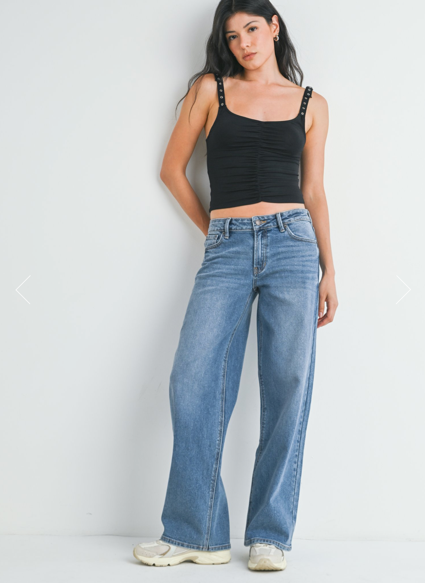 Crafted from soft, medium-wash denim, these jeans feature a relaxed, baggy fit with a flattering low-rise waist for a laid-back, casual look. Perfect for pairing with a sleek top or a casual tee, these jeans offer a stylish yet comfortable fit.