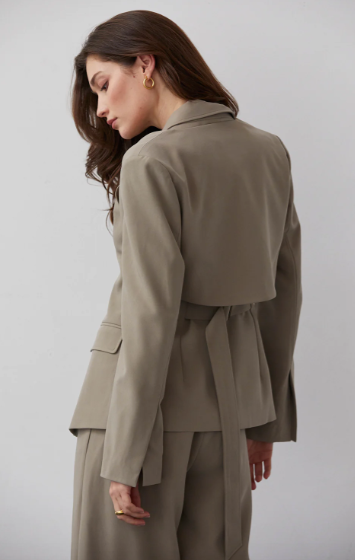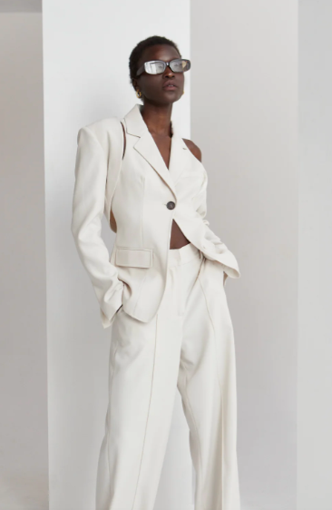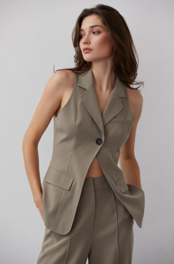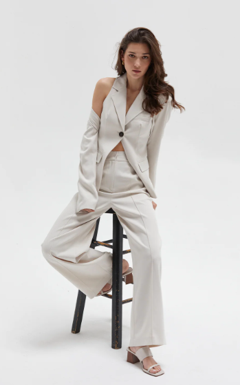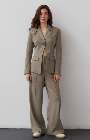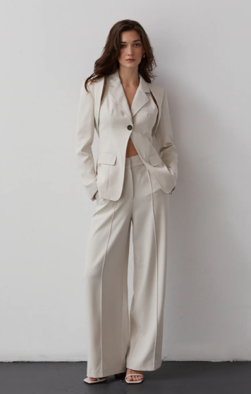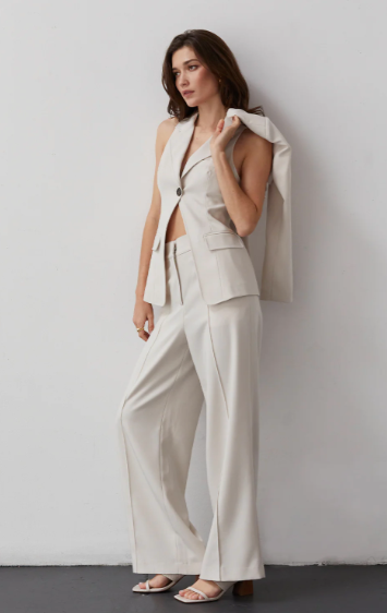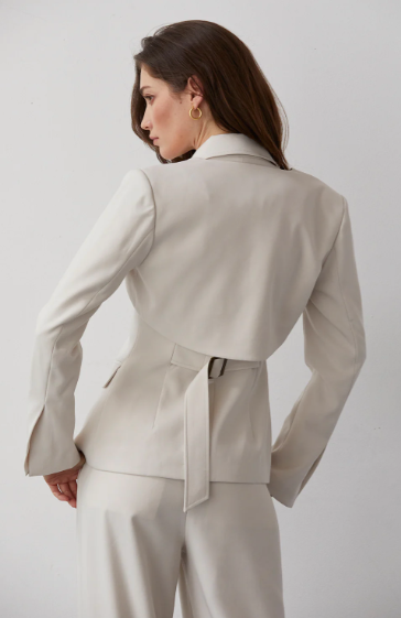 The Penelope Bolero Blazer Set comes with a bolero top and a vest that brings an illusion of wearing a single-piece blazer. The bolero top has lightly padded shoulders with slit detail on sleeve edge. The matching vest features notched collars, open front with single button closure and adjustable back buckle. Complete the look with the matching Penelope Wide Leg Trousers.